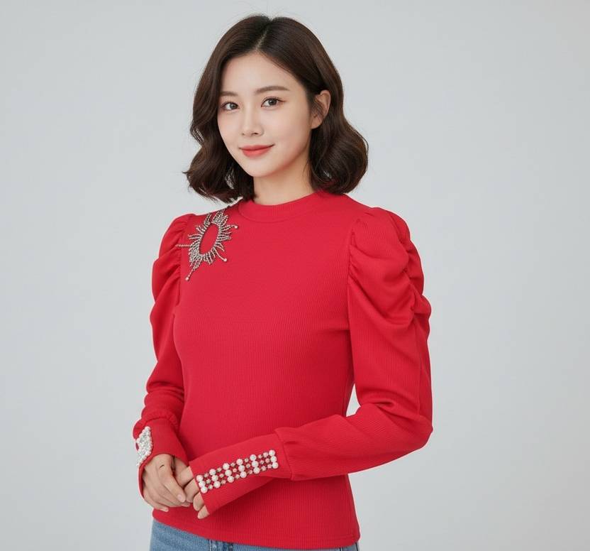 Crafted from premium ribbed fabric, it offers a comfortable body-hugging fit. The standout features include a unique silver sunburst brooch on the chest and exquisite pearl and crystal detailing on the cuffs, making it a perfect choice for evening parties, birthdays, or festive gatherings. Pair it with light-wash denims or a sleek skirt for a head-turning look.