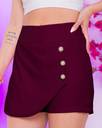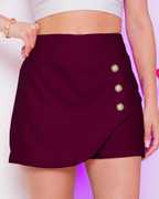 Show off stylish perfection in this chic wrap skort! It features a high-rise waist, a wrap-front design with ruched detailing, and fitted shorts with side attached Buttons. This smooth fabric has a moderate stretch. Complete your look for weekend plans with a fitted bodysuit and clear mules.