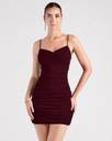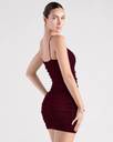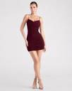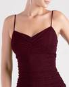 Sleeveless V-wire neckline, Spaghetti straps, Side ruched seams, Bodycon silhouette, Mini-length hem, Glitter mesh fabric, sewn-in knit lining, moderate stretch, Runs true to size