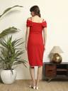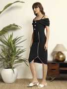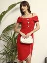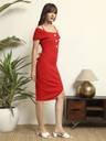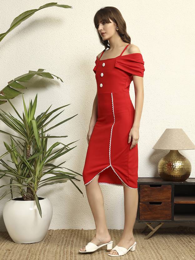 Turn heads with this stunning cherry red cold-shoulder bodycon dress, designed to make you stand out effortlessly. Featuring a flattering off-shoulder neckline with supportive spaghetti straps, this dress strikes the perfect balance between chic and playful. The bodice is adorned with three bold white buttons for a touch of retro charm, while the asymmetrical hemline with delicate white lace detailing adds a unique, feminine twist. Made from a soft, stretchable fabric, this dress hugs your curves beautifully and offers all-day comfort. Ideal for parties, date nights, or any occasion where you want to steal the spotlight!