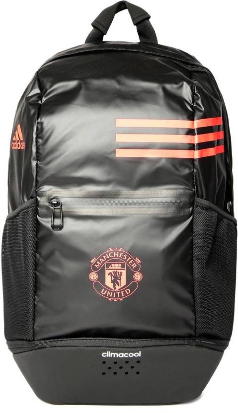 Black backpack, has Manchester United branding and Adidas patented tri-stripes on the front, and Climacool technology. A short padded haul loop on the top, two padded and adjustable shoulder straps with Climacool technology for superior airflow and easier cooling. One main concealed zip compartment, has a padded laptop sleeve. A zip pocket and a shoe garage compartment on the front. A mesh stash pocket on each side. Mesh padded back. Warranty: 3 months from the date of purchase against manufacturing defects. Adidas presents their stylish new range of backpacks. The bulky carryall is given a modern twist with a compact structure and smart allocation of space to accommodate all your essentials. All good things in small packages indeed.
