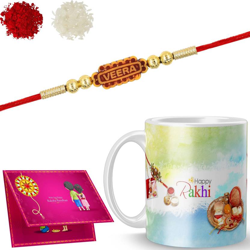 ADN Designer Shree-Dora9-58_Rakhi-set-MME9_2006 Gold Finish Rakhi, Chawal Roli Pack, Greeting Card, Mug Set (1 Rakhi, 1 Mug, 1 Roli & Chawal, 1 Card)