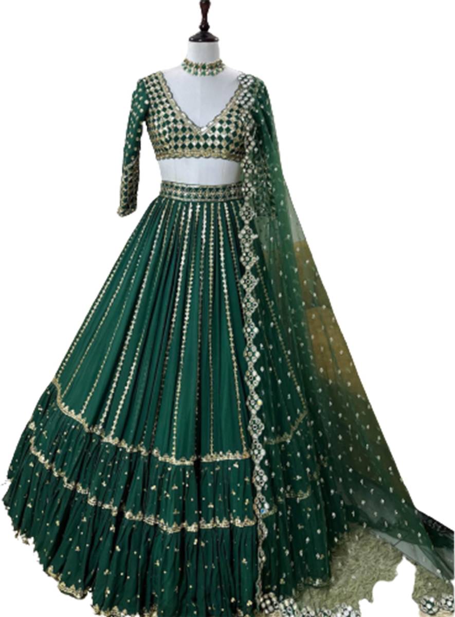 Lehenga choli detail Lehenga Choli Fabric Lehenga Fabric :- Faux Georgette Choli Fabric:- Faux Georgette Dupatta Fabric:- NET Lehenga Choli Inner:- Raw Micro Silk Lehenga Choli Work:- Sequence 3mm, Multi Niddle Work, Embroidery Work, Zari Work Lehenga Choli Stitching Type :- Lehenga Semi Stitched , Blouse Unstitched Dupatta Length :- 2.20 mtrs Lehenga :-4.20 Mtrs