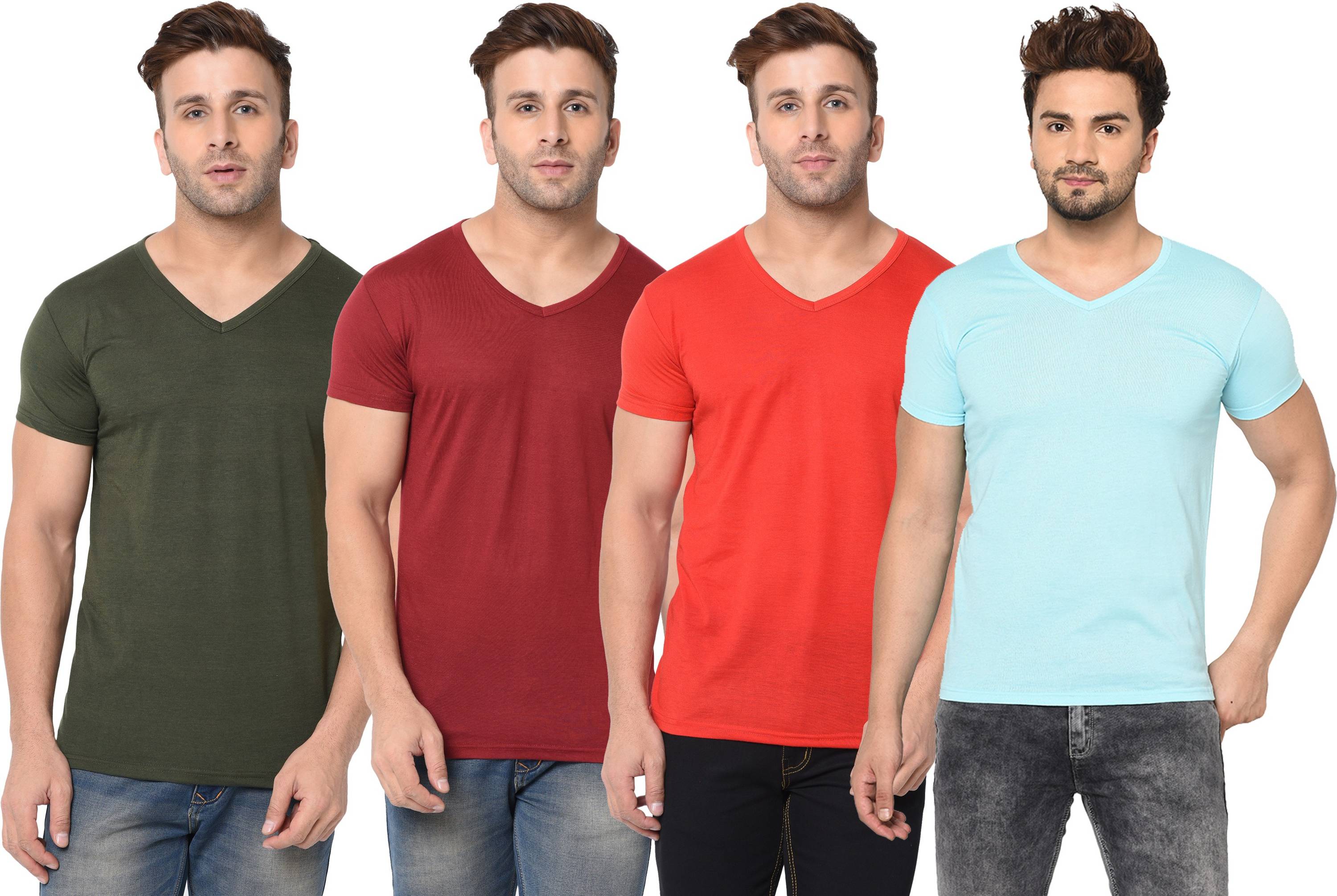 Pack of 4 V neck Combo T-shirts Multicolor Men Solid V Neck Cotton Blend Multicolor T-Shirt