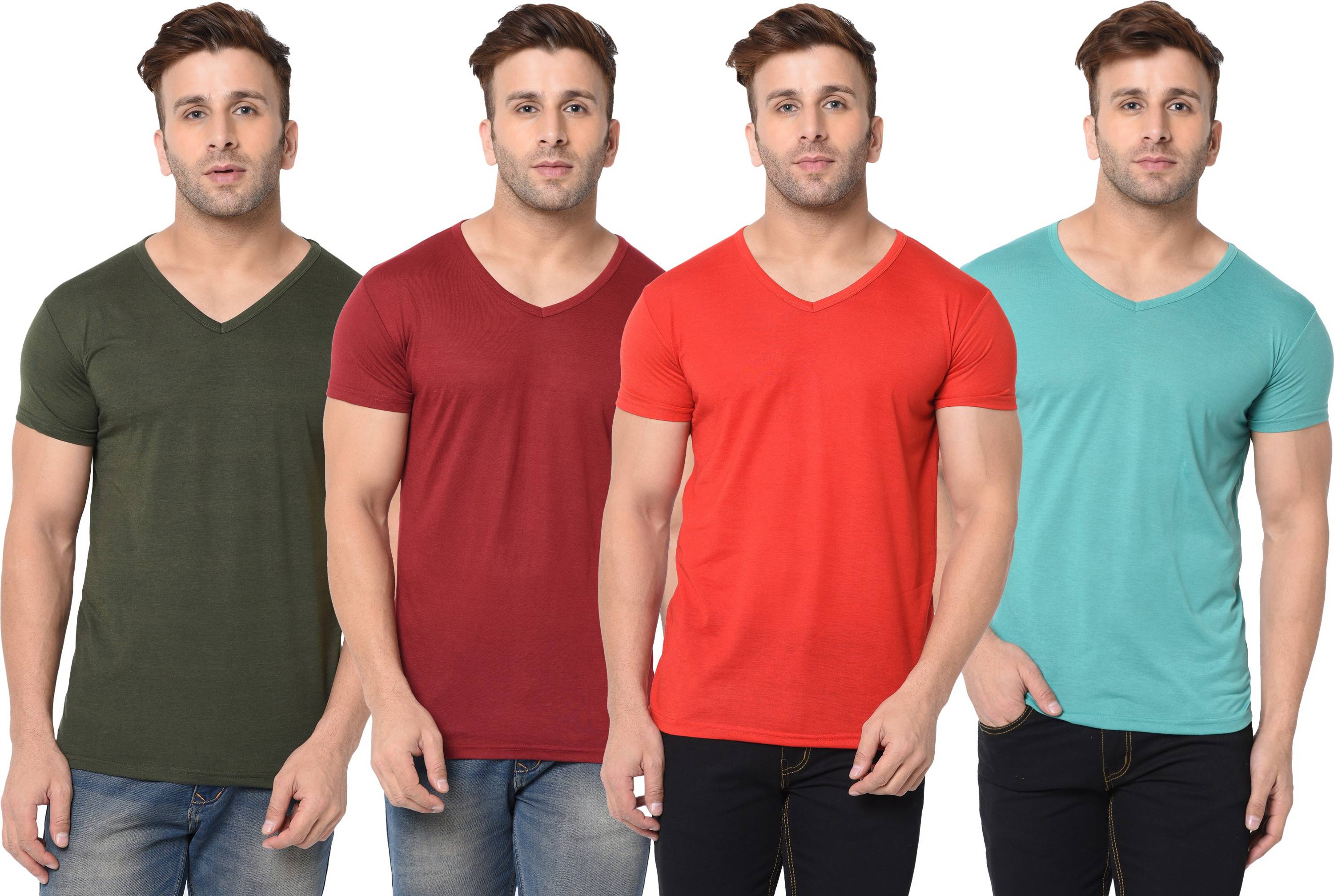Pack of 4 V neck Combo T-shirts Multicolor Men Solid V Neck Cotton Blend Multicolor T-Shirt
