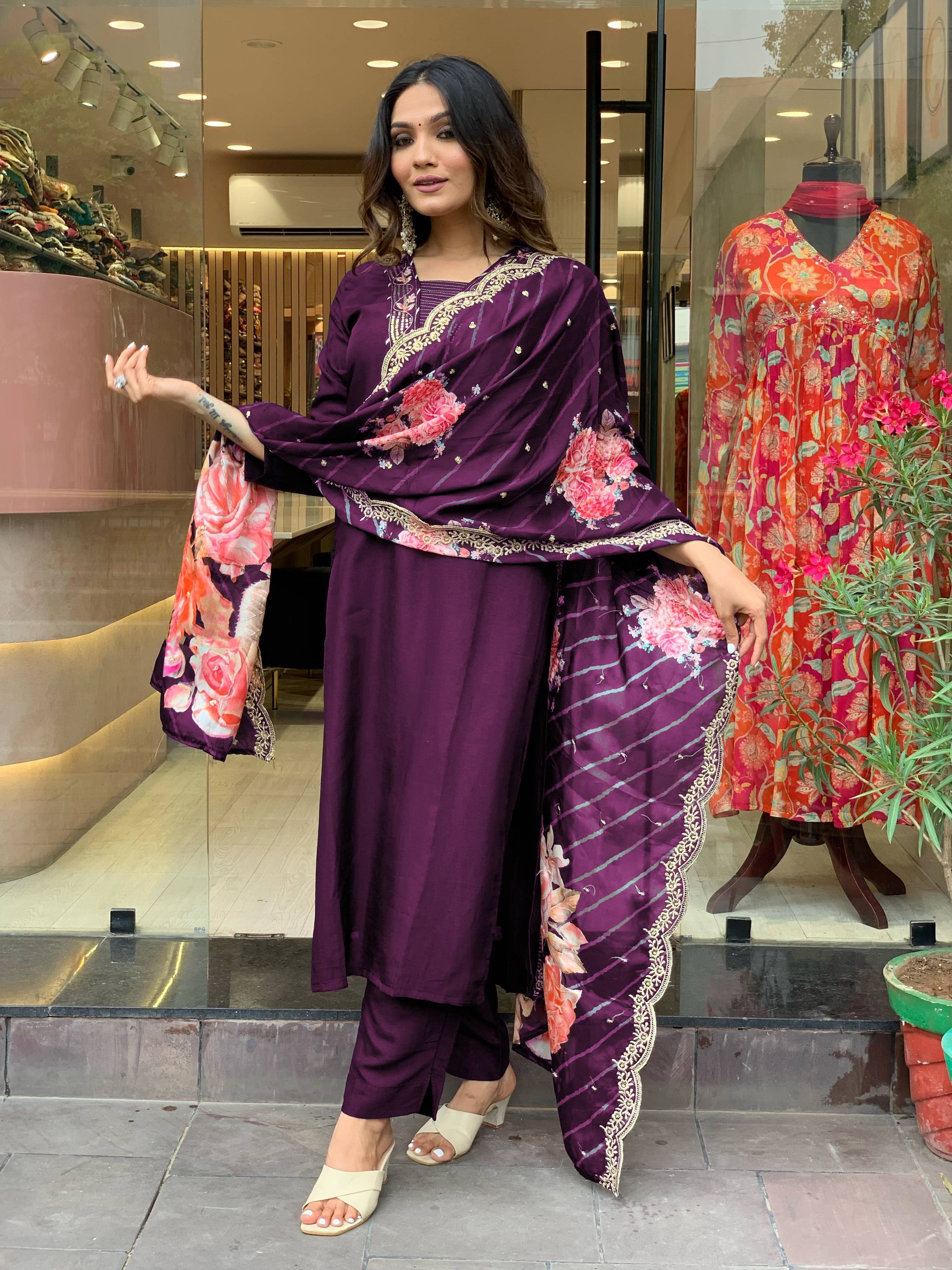 Enhance your traditional wardrobe with this elegant ethnic tunic and pant set. Designed with vibrant floral patterns in shades of purple and pink on a dark base, this outfit is perfect for festive occasions or casual gatherings. The tunic features a flattering v-neckline and 3/4 sleeves, paired with comfortable harem-style pants that add a trendy touch to this classic design. Made from high-quality fabric, it ensures both comfort and style. The set can be easily styled with traditional jewelry, sandals, and a clutch to complete your look. A versatile piece, it can be worn for a variety of cultural and casual events.