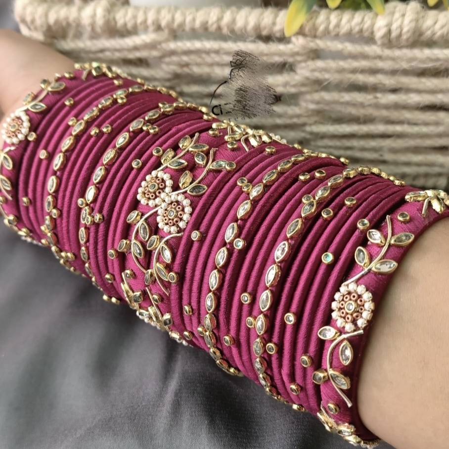 Make a bold and beautiful statement with this handcrafted set of silk thread bangles in a rich magenta color. These bangles are adorned with a combination of sparkling ball chains, elegant pearl chains, and intricate kundan work, creating a perfect blend of traditional and modern aesthetics. The vibrant magenta hue adds a regal touch, making these bangles ideal for weddings, festivals, and special occasions. Whether you're dressing up for a haldi ceremony, Diwali celebration, or a festive gathering, these bangles are designed to complement your ethnic outfits like sarees, lehengas, and suits. Lightweight and skin-friendly, they ensure both style and comfort all day long.