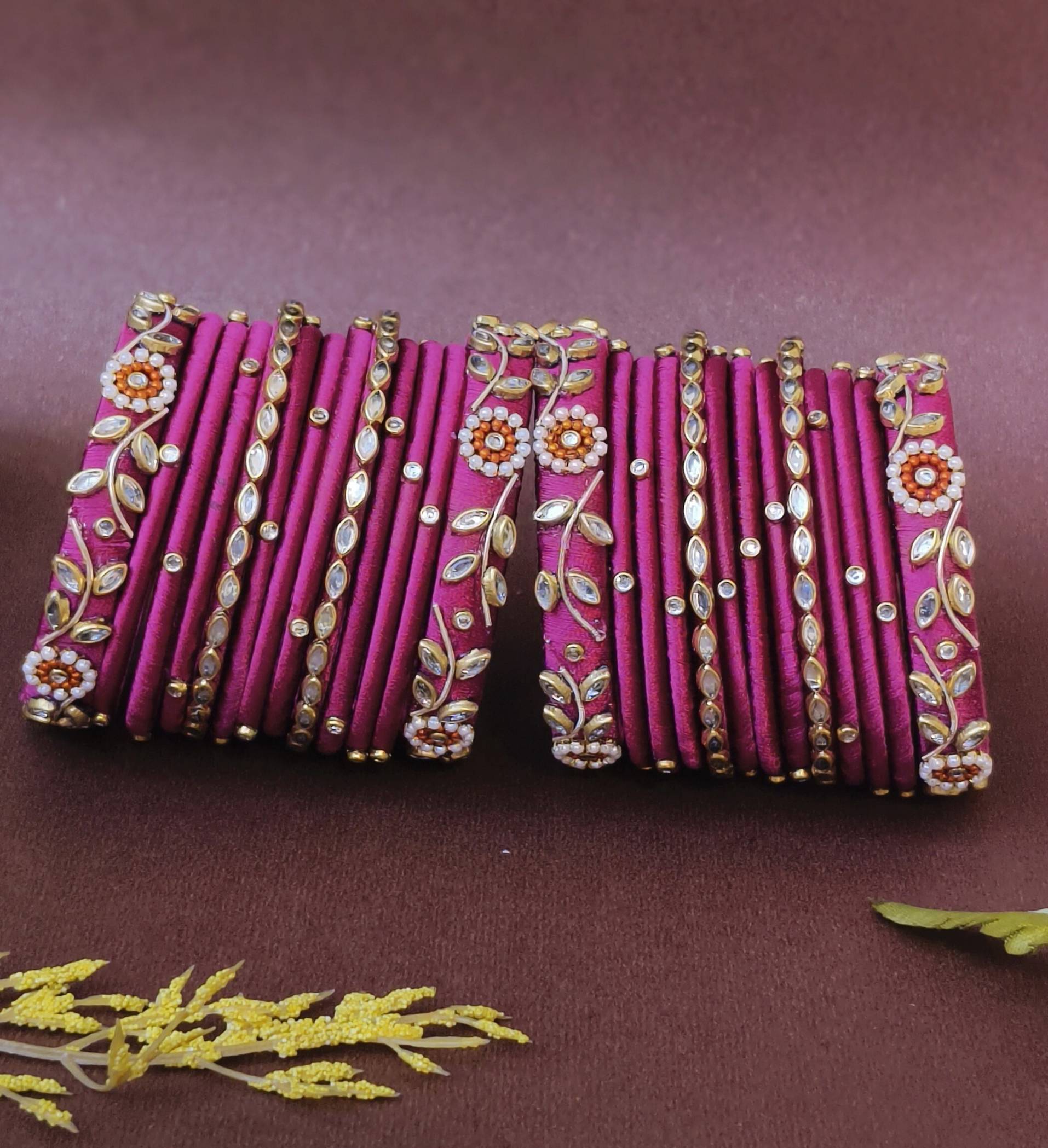 Make a bold and beautiful statement with this handcrafted set of silk thread bangles in a rich magenta color. These bangles are adorned with a combination of sparkling ball chains, elegant pearl chains, and intricate kundan work, creating a perfect blend of traditional and modern aesthetics. The vibrant magenta hue adds a regal touch, making these bangles ideal for weddings, festivals, and special occasions.