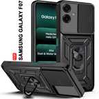 Compatible with Samsung Galaxy F07 Only., Camera Lens Protection: Built-in slider design that protects the camera lens from scratches, dust, and accidental impacts., Built-in Kickstand: Convenient, fold-out kickstand for hands-free viewing, ideal for watching videos, video calls, or browsing., Sturdy and Durable: Made from high-quality, materials that provide excellent protection against drops and impacts., Magnetic Mount Compatibility: Built-in metal plate for seamless compatibility with magnetic car mounts and other magnetic accessories.