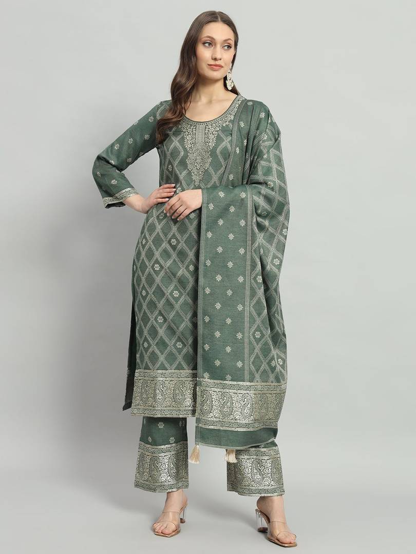 This pretty piece is a fairy tale that begins to unfold as you reveal your beauty in it. Look ethnic in this dress material. This acro wool woven suit is beautifully adorned with woven work comes along with acro wool bottom and dupatta, making it appear more adorning. Women can buy this suit to wear for their upcoming festivals, homely functions, parties, kitties, weekends get together. Get this unstitched suit stitched according to your fit and comfort. Team it with stylish accessories to make your looks more beautiful. Note:- The actual product may differ slightly in color and design from the one illustrated in the images when compared with a computer or mobile screen.