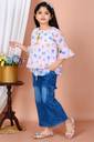 This charming outfit features a young girl dressed in stylish denim jeans paired with a vibrant floral top, perfect for any casual occasion. The durable denim offers comfort and flexibility, while the floral design adds a touch of whimsy and femininity. Ideal for playdates or family outings, this ensemble combines practicality with a trendy aesthetic, making it a must-have addition to your child's wardrobe. Elevate her style with this delightful combination that celebrates both comfort and fashion.