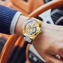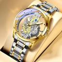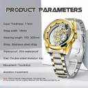 Luxury Skeleton Automatic Mechanical Watch for Men. Designed with a two-tone stainless steel strap in gold & silver finish, this timepiece combines durability with premium elegance. The transparent skeleton dial highlights the intricate moving gears, giving it a bold and modern look.