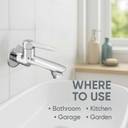 | Key Features | - Solid Brass Construction – Ensures long-lasting durability, corrosion resistance, and strength., Chrome Plated Finish – Provides a shiny, scratch-resistant surface, enhancing the aesthetic appeal of your bathroom or kitchen., Long Body Design – Ideal for easy access and comfortable water flow, making it perfect for washbasins, sinks, and utility areas., Leak-Proof Ceramic Cartridge – Ensures a drip-free experience and smooth quarter-turn operation., Wall Flange Included – Provides a secure and elegant installation, covering wall openings for a clean and professional look., Splash-Free Aerator – Offers a controlled water stream, reducing water wastage while ensuring a soft and uniform flow., Ideal for Multiple Applications – Suitable for bathrooms, kitchens, gardens, and commercial spaces.
