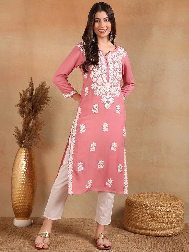 The Viscose Rayon Fabric in this attractive Pink Color ready to wear Styles Kurta will make sure that the fitting of this beautiful readymade Styles Kurta looks elegant on you. Crafted from Vivaanta Fashion Round Neck Styles Chikankari, Embroidered Pattern With Calf Length Straight Kurta Shape, it is light in weight and will be soft against your skin. Its unique Machine Weave design and beautiful Pink colour will fetch a lot of second glances as you club it with contrast colored pumps and flashy accessory.