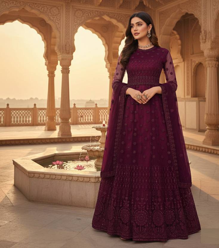 Color : Dark Rani, Introducing our Women's Net Embroidered Semi-Stitched Gown.The modern woman who appreciates tradition and style will find her ideal match in our Women's Net Embroidered Semi-Stitched Gown. You will look and feel your best on your wedding day thanks to the special quality and to detail that have gone into each piece.Gown is Comes With Inner and Dupatta Available 2.20 Meter.Gown Length is 57 Inch. It has Full Sleeves with Embroidered Work. Gown is Semi-Stitched which can be fitted up to 44 inch Bust Size. Dry Clean Or Normal Hand Wash.