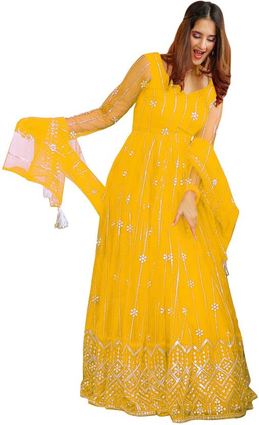 Color : Yellow, Introducing our Women's Net Embroidered Semi-Stitched Gown.The modern woman who appreciates tradition and style will find her ideal match in our Women's Net Embroidered Semi-Stitched Gown. You will look and feel your best on your wedding day thanks to the special quality and to detail that have gone into each piece.Gown is Comes With Inner and Dupatta Available 2.20 Meter.Gown Length is 57 Inch. It has Full Sleeves with Embroidered Work. Gown is Semi-Stitched which can be fitted up to 44 inch Bust Size. Dry Clean Or Normal Hand Wash.