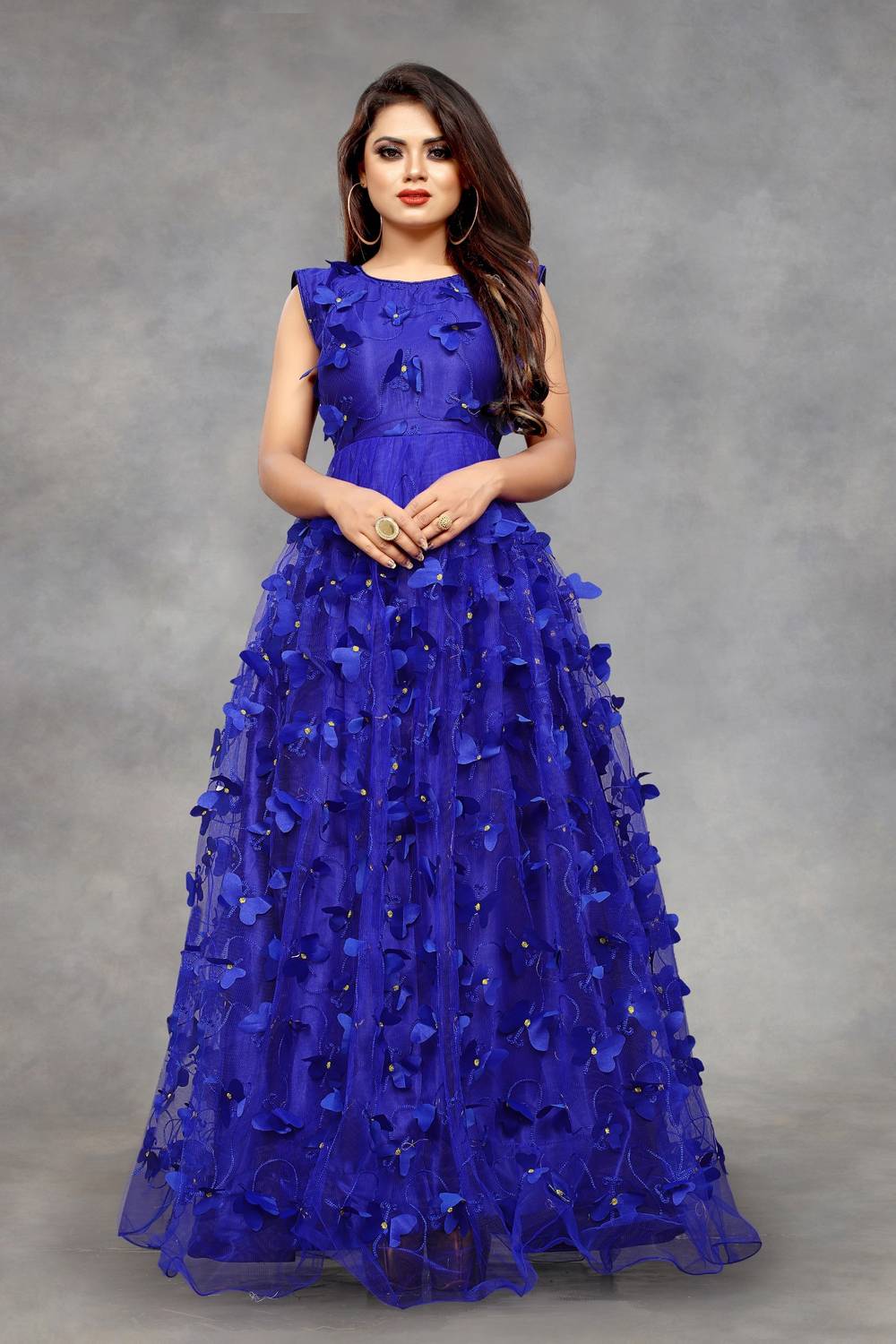 This Gown is Crafted with Butterfly over Net Fabric Having Embroidery Work on it. Gown is Comes With Inner Attached. Gown Color Royal Blue, Gown Length is 56 Inch. It has Sleeveless Gown. Gown is Semi-Stitched which can be fitted up to 42 inch Bust Size. Gown is Emblished with Fancy Butterfly. Dry Clean Or Normal Hand Wash. Product Color May Slightly Variation Due To Photographic Lighting Or Your Screen Settings And Other Accessories Are Only Modelling Purpose.