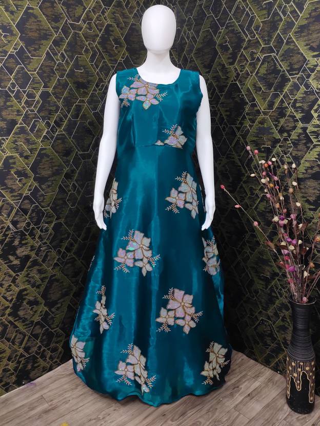 Color : Petrol, Introducing our Women's Jimmy Choo Embroidered Semi-Stitched Gown.The modern women who appreciates tradition and style will find her ideal match in our Women's Jimmy Choo Embroidered Semi-Stitched Gown.Gown is Comes With Inner.Gown Length is 57 Inch. Neck : Round Neck .It has Sleeveless Gown. Gown is Semi-Stitched which can be fitted up to 44 inch Bust Size. Dry Clean Or Normal Hand Wash.