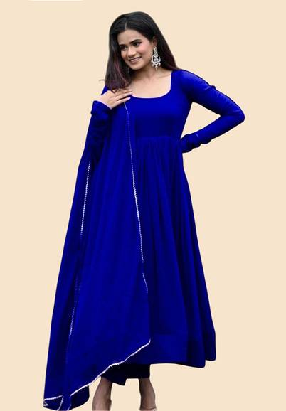 This beautiful Blue Georgette Solid anarkali suit is a classic piece that goes well with any outfit and is ideal for grateful occasions. For ladies of all ages and body shapes, the flowing silhouette and detailed detailing make it a versatile and flattering option. This elegant and comfortable anarkali suit is made of quality fabric, ensuring that you will always look and feel your best.Size: S,M, L, XL, XXL,(Select As Per Your Requirement), Type: Readymade Printed Gown With Dupatta, Length: 50 Inches, Dupatta : 2 Mt, Bust Size: S-36",M - 38", L - 40", XL - 42", XXL - 44", Waist Size: S-32",M - 34", L - 36", XL - 38", XXL - 40" ,.The standout feature of this gown is its stunning print.Neck : Round, Sleeve : Full Sleeve
