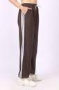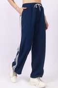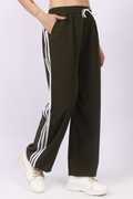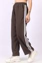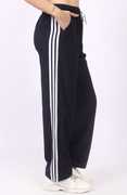 A pair of women’s casual track pants in a many color. The pants feature an elastic waistband with a white drawstring for adjustable comfort and side pockets for convenience. A sporty touch is added with three vertical white stripes running down the length of each leg. The relaxed, straight-fit design pairs well with sneakers, making it suitable for casual wear, workouts, or lounging.