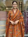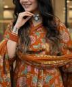 Yeh beautiful orange floral rayon kurta set summer wear ke liye perfect choice hai. Soft aur breathable rayon fabric skin-friendly hota hai jo pure din comfort deta hai. Iska elegant floral print aur flowy Anarkali pattern traditional aur modern look ka perfect combination hai. Matching palazzo pants aur printed dupatta is outfit ko festive, casual aur daily wear ke liye ideal banate hain.