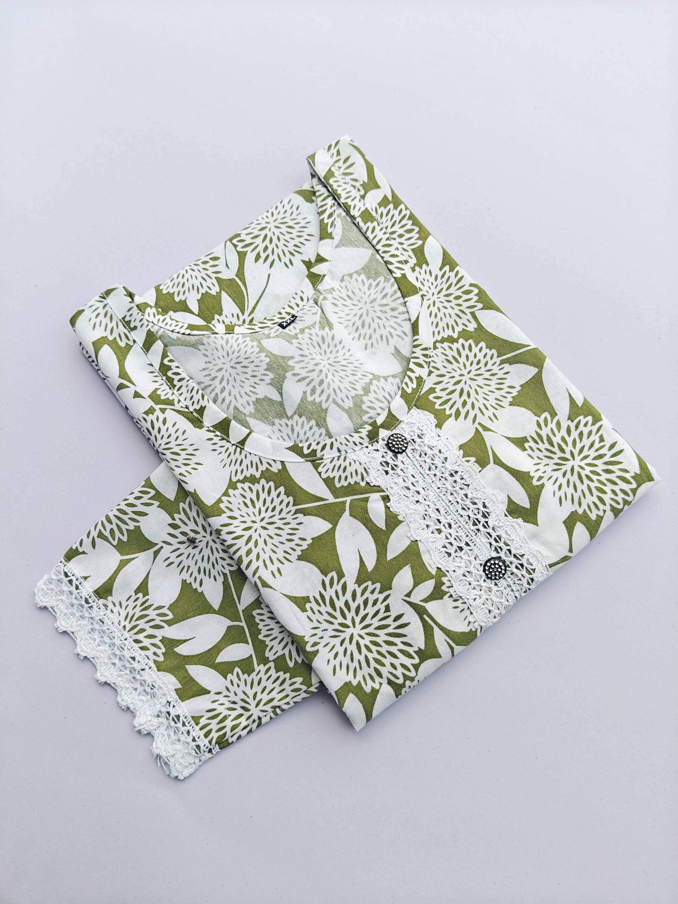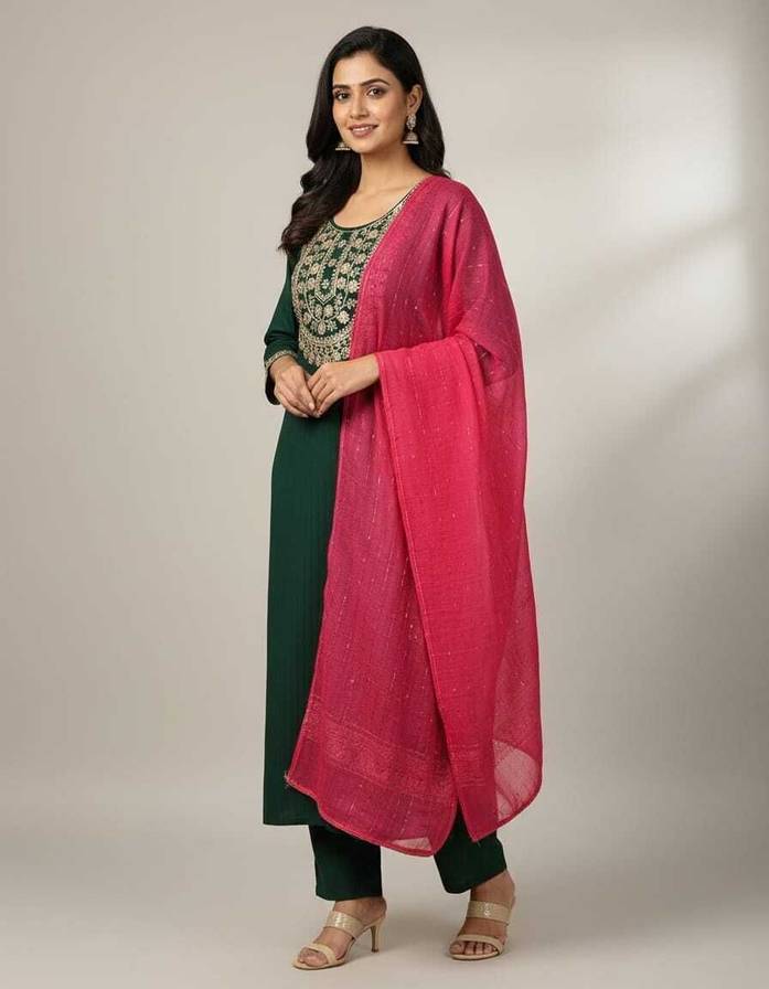 Yeh beautiful Green floral rayon kurta set summer wear ke liye perfect choice hai. Soft aur breathable rayon fabric skin-friendly hota hai jo pure din comfort deta hai. Iska elegant floral print aur flowy Anarkali pattern traditional aur modern look ka perfect combination hai. Matching palazzo pants aur printed dupatta is outfit ko festive, casual aur daily wear ke liye ideal banate hain.