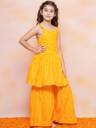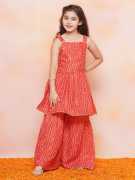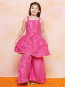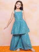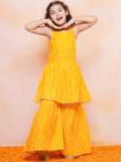 Light, breathable and beautiful sharara set shall definitely be her go-to ethnic pick for any festive occasion. The Kurta and Sharara are made in Cotton, adorned with ornamental laces. The relaxed silhouette and natural material ensure the utmost comfort for the little one, so the best smile is always on.