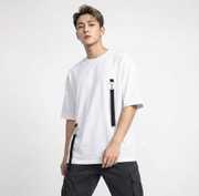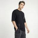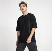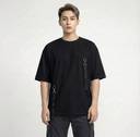 This black T-shirt features a clean, modern streetwear design with functional details. It is made in a relaxed, oversized fit with short sleeves and a classic round neckline for everyday comfort. The shirt includes a horizontal seam across the chest that adds structure and visual interest. Two contrasting black utility straps with metal clip accents are placed on the front, giving the T-shirt a contemporary, techwear-inspired look. Crafted from soft, breathable fabric, this T-shirt is ideal for casual wear and urban fashion styling.