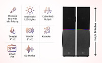 Featuring a wireless microphone with a range of up to 10 m, this Bluetooth tower speaker is ideal for karaoke nights, hosting events, or interactive entertainment. The multicoloured LED lights add a vibrant touch, creating a lively atmosphere to match the music. With an RMS output of up to 120 W, along with a dedicated tweeter and woofer, this system delivers detailed highs and deep lows. Moreover, the inbuilt FM radio, EQ modes, stereo configuration, and frequency response down to 40 Hz ensure versatility for various audio preferences.