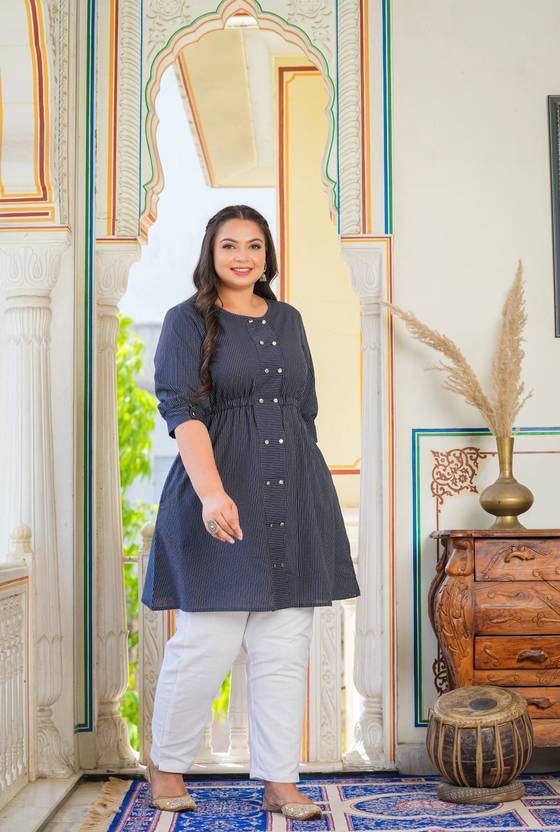 An amazing range of women Dresses in soft and solid colors that looks perfect for regular wear. With beautiful designs and patterns. These apparels are very stylish and comfortable too. Get rid of the 'regular' look this season wearing Dress by AKIKO. With a perfect blend of comfort and traditional style, This Blue Stripes A-Line Dress from AKIKO exhibits Tich buttons, elasticated waistline, Cuff Sleeves, Side Pockets Along with Round Neck & 3/4th Sleeves. Tailored from Kantha Cotton . Length: 35 Inches.