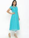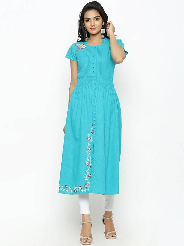 An amazing range of women Kurtas and kurtis in soft and solid colors that looks perfect for regular wear. With beautiful designs and patterns. These apparels are very stylish and comfortable too. Get rid of the 'regular' look this season wearing Kurta and Kurtis by AKIKO. With a perfect blend of comfort and traditional style, This๏ฟฝTeal Embroidery Kurta from AKIKO exhibits Potali buttons detailing, Pintex on yoke, Bird & floral embroidery on right shoulder & hemline, elastic on waist along with Short Sleeves & Mandarin Collar. Tailored from Cotton Slub Fabric.
