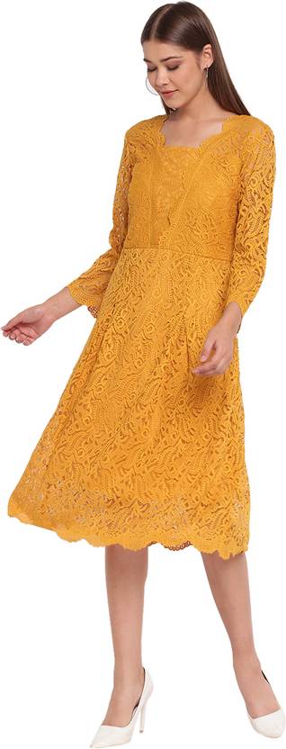AKIMIA Women Fit and Flare Yellow Below Knee Dress