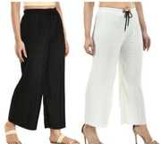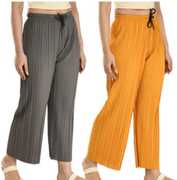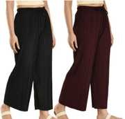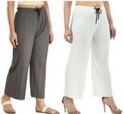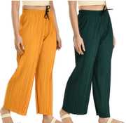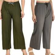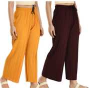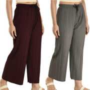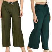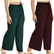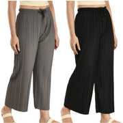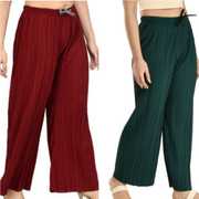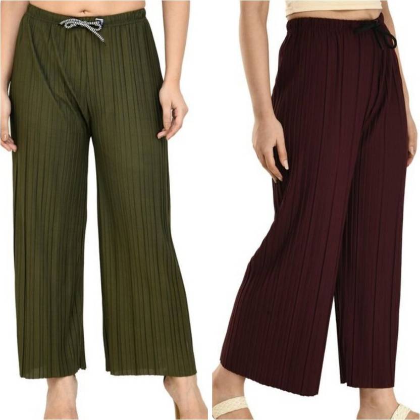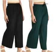 This pleated palazzo pants crafted from a lightweight, flowy fabric that offers comfort and style. The pants feature a high-rise elasticated waistband for a snug yet flexible fit, while the finely done vertical pleats add texture and a touch of sophistication. The wide-leg silhouette enhances ease of movement and lends a graceful drape, making them perfect for both casual daywear and elevated evening looks.