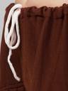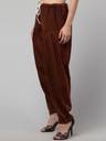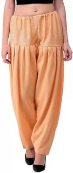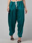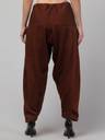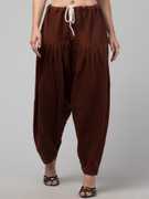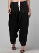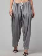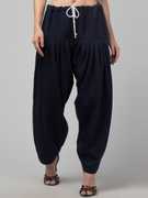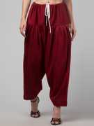 This garment is a pair of Woolen women's relaxed-fit salwar trousers featuring a distinctly traditional yet modern silhouette. It is constructed from a soft, knit jersey fabric that drapes comfortably. The trousers are characterized by a gathered waistband that is secured with an adjustable white drawstring. The design incorporates generous pleating at the upper front, giving the garment its characteristic volume, and it tapers slightly towards the ankle. The overall style emphasizes comfort and a flowy fit.