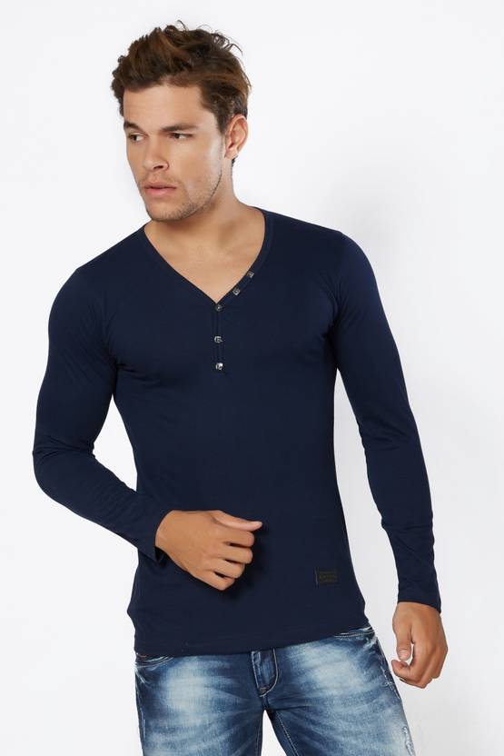 Alan Jones Men Solid Henley Neck Cotton Blend Dark Blue T-Shirt