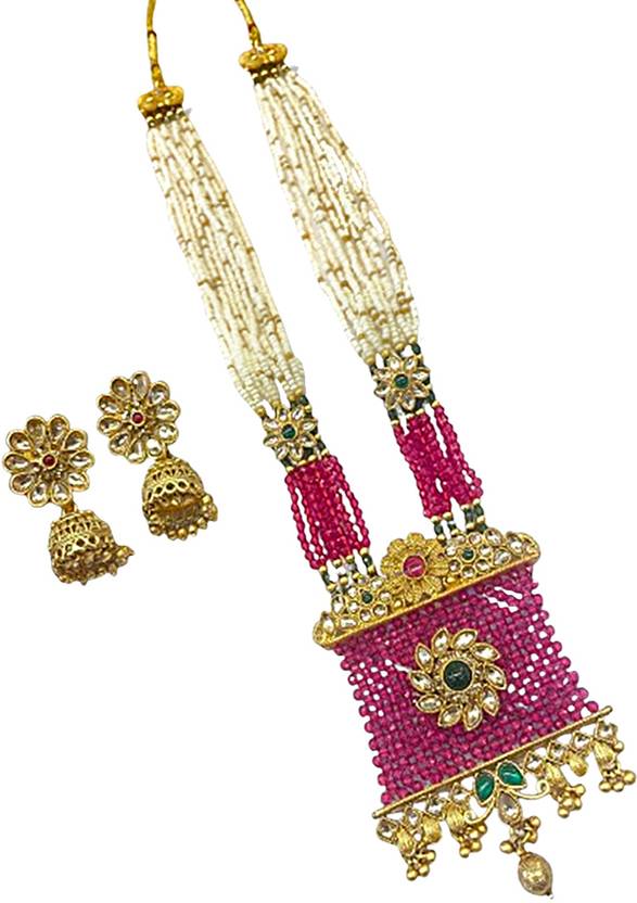 Made for those who appreciate luxury and classic beauty, this statement necklace and earring set is crafted with intricate details and adorned with shimmering crystals. Inspired by the regal jewelry of royal Rajwadi heritage, this exquisite set features a traditional chatai pattern and brings a touch of royalty to any ensemble. Perfect for weddings, festivals, and special occasions, it's truly a timeless piece of elegance and craftsmanship.