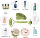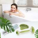 Facial Massage Roller with Gua sha Board to help stimulate circulation, promote collagen production and helps reduce the appearance of fine lines and wrinkles, face lift effect. The under Eye Press Facial Massager helps reduce puffy eyes and dark circles, used consistently with anti-wrinkle creams and serums, many women have observed improved skin tone and a reduction in fine lines and wrinkles. Facial Roller Massager - Anti Aging Rose Quartz Roller for Face and Dark Circles under Eye. To use the bigger jade facial roller - Use the big face roller on your chin, forehead, cheeks and neck. Start in the middle of the face and roll upward and outward. Move from the neck and roll upwards across the chin. To use the smaller end - Use the small roller part under the eyes and around the nose. Roll the face roller massager in an upward and outward motion. A facial roller for women to relax and calm. How to Gua sha green massage - The flat jade stone that has curved sides is gently pressed along your face, moving upward and outward. Gua sha can also be used for your larger muscles, such as areas on your shoulder. Use the flat stone and it helps to relieve pain and stiffness