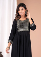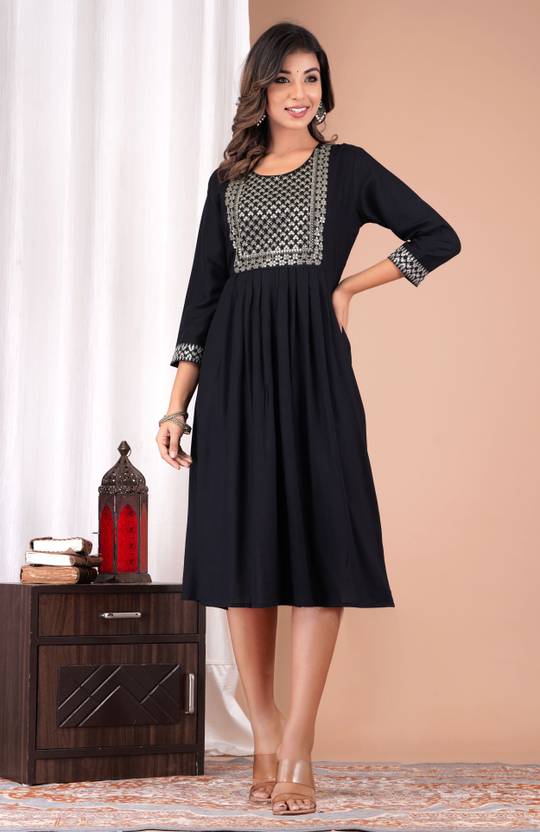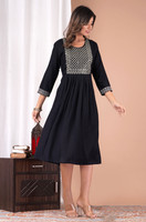 This dress boasts a classic appeal with its well-thought-out design elements. The round neck exudes a timeless charm, framing the neckline elegantly. Its below-knee length adds a touch of modesty and grace, making it versatile for various occasions. Also, complementing this, the three-quarter sleeves of this dress strike the ideal balance between coverage and comfort.