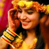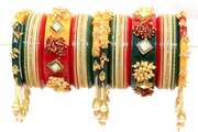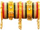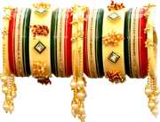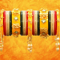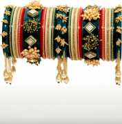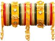 Striking round-shaped bead designs and a golden touch adorn the outer bangles, with a centerpiece exuding opulence