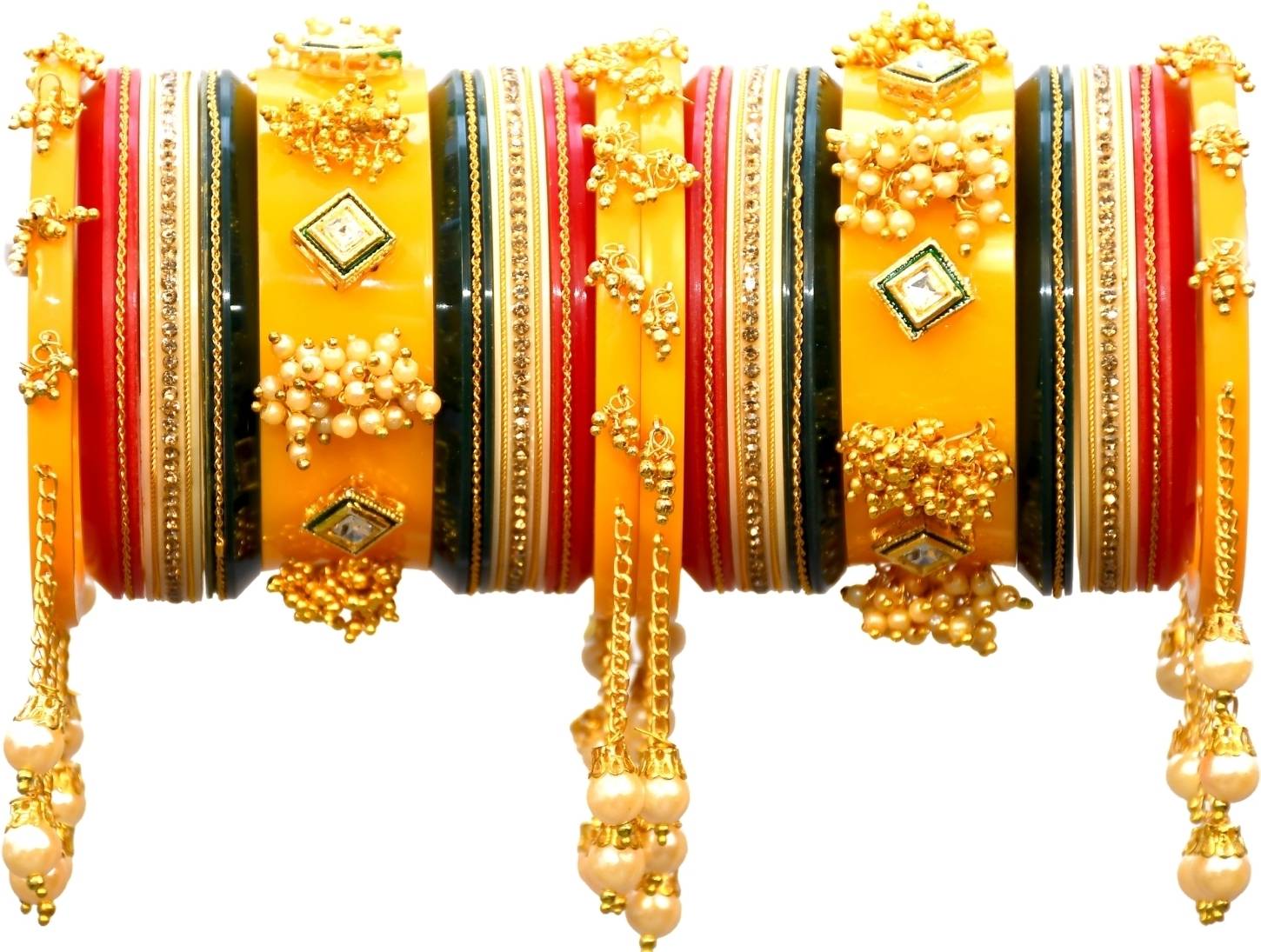 American Diamond, Synthetic Gemstones, The centerpiece of these chura showcases four square diamonds delicately encased in a 3D golden frame. The intricate square, round glass design, adorned with a golden frame, adds a touch of opulence to the overall aesthetic, The dangling pearls, elegantly suspended from golden chains, create a mesmerizing effect as they sway with your every movement. In addition, the beaded pearls and beads contribute to the overall allure of the piece, Indulge yourself in the timeless beauty of our choora, a masterpiece that perfectly marries tradition with contemporary elegance. With its intricate craftsmanship and exquisite details, this chura is a testament to the rich heritage of Indian jewelry. Whether worn on special occasions or cherished as a treasured heirloom, our chuda will undoubtedly become a cherished symbol of your unique style and grace