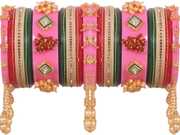 Introducing our exquisite Chura, blending traditional elegance with contemporary design, This captivating piece features a round stone and elephant moti at the center, encased within a delicate frame, Dazzling diamonds adorn four rose gold-colored bangles, while hanging bead bangles with metal leaf studs add a touch of tradition, Delicate beads suspend from a metal frame, enhancing the allure, Striking round-shaped bead designs and a golden touch adorn the outer bangles, with a centerpiece exuding opulence, Immerse yourself in our Indian Chura, a symbol of grace and beauty for any occasion
