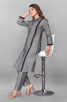 Featuring a solid pattern with stripe details, this women’s kurta and pants set combines simplicity with a hint of character. The clean, solid base creates a smooth and balanced appearance, while the subtle stripes add dimension without overwhelming the look. Moreover, the pattern highlights the natural flow of the fabric, bringing an understated elegance to this set.