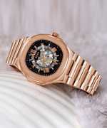 The ALIX Automatic Skeleton Watch is a sophisticated and elegant timepiece that combines classic design with modern elements. The skeleton dial, showcasing the intricate mechanics of the automatic movement, offers a unique and captivating aesthetic. The rose gold accents, including the hands, case, and indices, add a touch of luxury and sophistication.