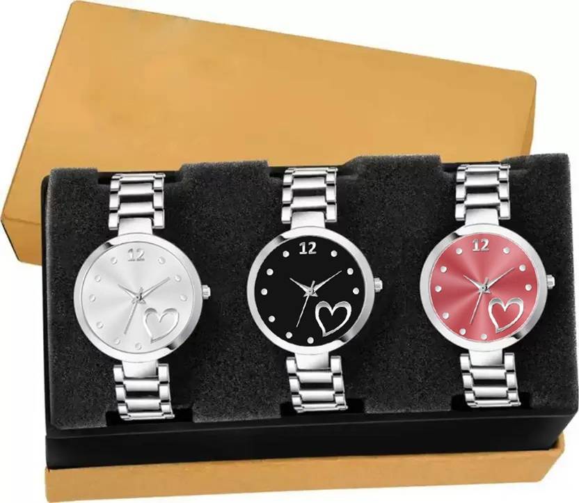 Pack of 3 Heart Dial Silver, Black & Pink Classic Elegance Chain watch for Girl