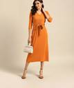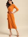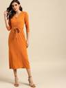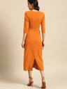 Orange solid sheathnbsp;dressV-neckThree-quarter, regular sleevesComes with a beltCalf length in straight hemButton closure.