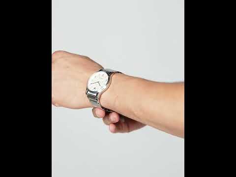 Designed specifically for men, this watch features a silver case and a white dial, creatin...