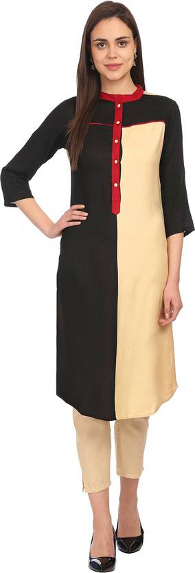 Women Colorblock Cotton Rayon Straight Kurta (Beige)