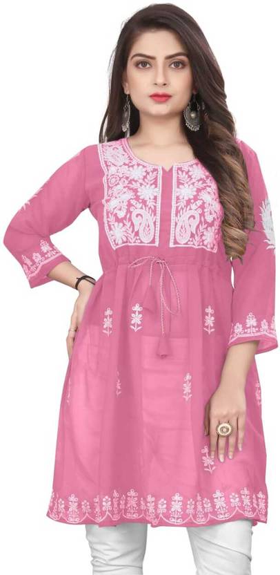 ALPS SHOP Embroidered short Kurti has a Round neck, long, regular sleeves,Embroidered detail Semi sheer Short Kurti,Style this kurti with light blue denim , and matching jwellery for perfact work wear look
