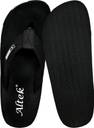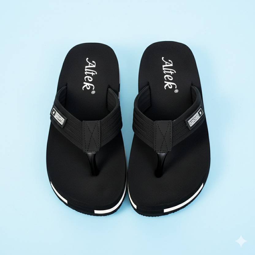 These stylish black flip-flops feature a comfortable footbed with 'Altek' branding and a durable black strap accented with a 'SPORTS' label. The sole is designed with white stripes for a modern look and a textured pattern for enhanced grip. Ideal for casual wear, beach outings, or poolside relaxation, these flip-flops offer both comfort and style. Compatible with swimwear, shorts, casual dresses, and loungewear.