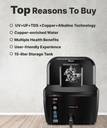 Leveraging innovative UV+UF+TDS +Copper+Alkaline technology, this water purifier ensures thorough purification of water. By removing dissolved impurities, such as chemicals, bacteria, viruses, and salts, it enhances the taste of water while retaining essential minerals. The unique copper filter infused water with copper in real time which as a result provides numerous health benefits.
